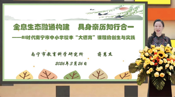 活动开篇,南宁市教育科学研究所德育教研员蒋慧杰老师以数字人形象云端亮相,带来题为《全息生态融通构建,具身亲历知行合一——AI时代南宁市中小学校本德育课程的创生与实践》的专题分享。